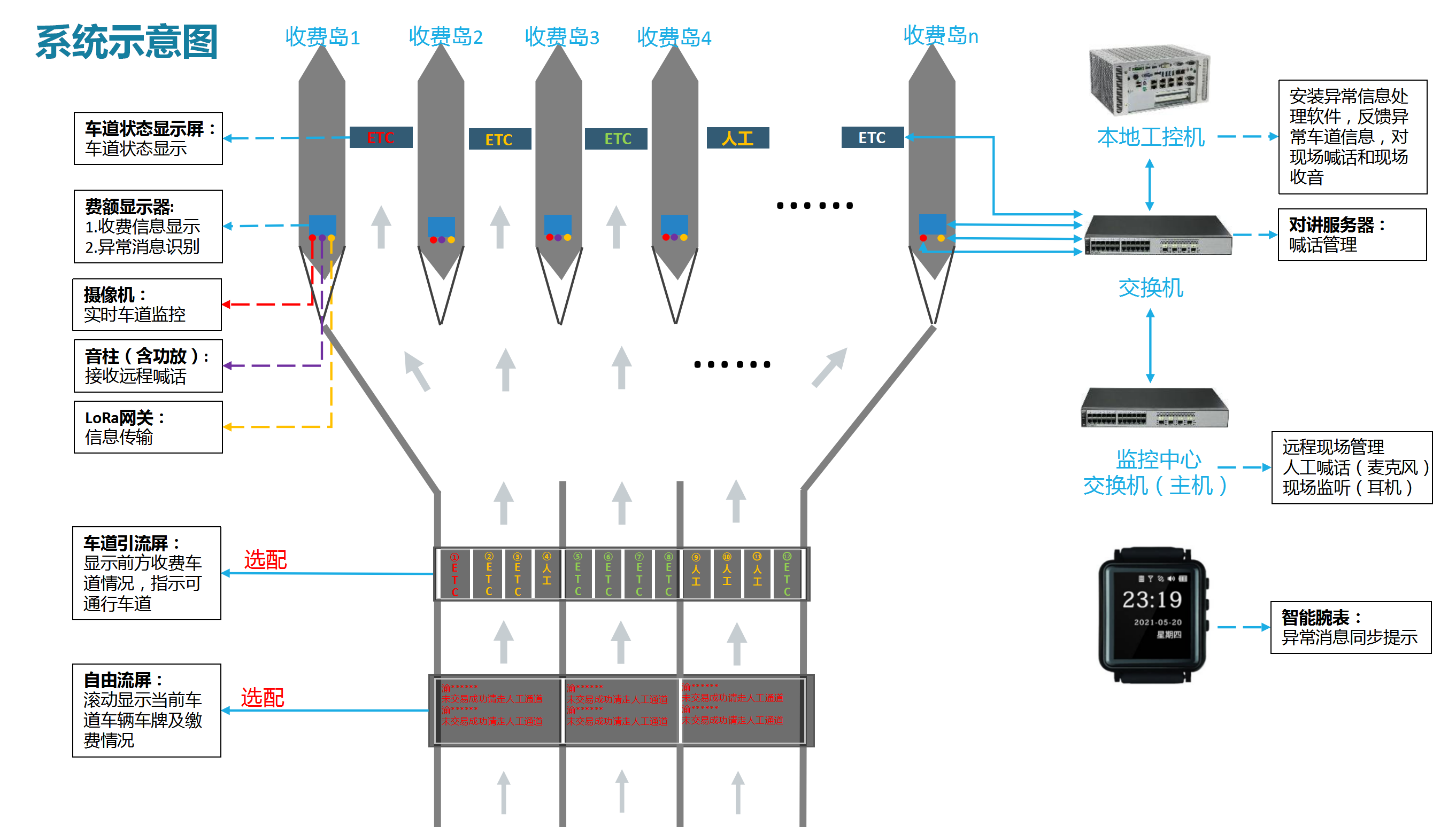 該系統(tǒng)由費(fèi)額顯示系統(tǒng)、語音提示系統(tǒng)、無線通信系統(tǒng)、車道狀態(tài)屏、車道引流屏共同組成。系統(tǒng)還配置了專門的軟件管理平臺,可對每一條收費(fèi)車道進(jìn)行實(shí)時(shí)監(jiān)控,管理人員無需到場即可通過“遠(yuǎn)程喊話”的形式處理特情。系統(tǒng)還可集成自由流屏和車道引流屏,一同助力打造暢行的高速公路收費(fèi)站。